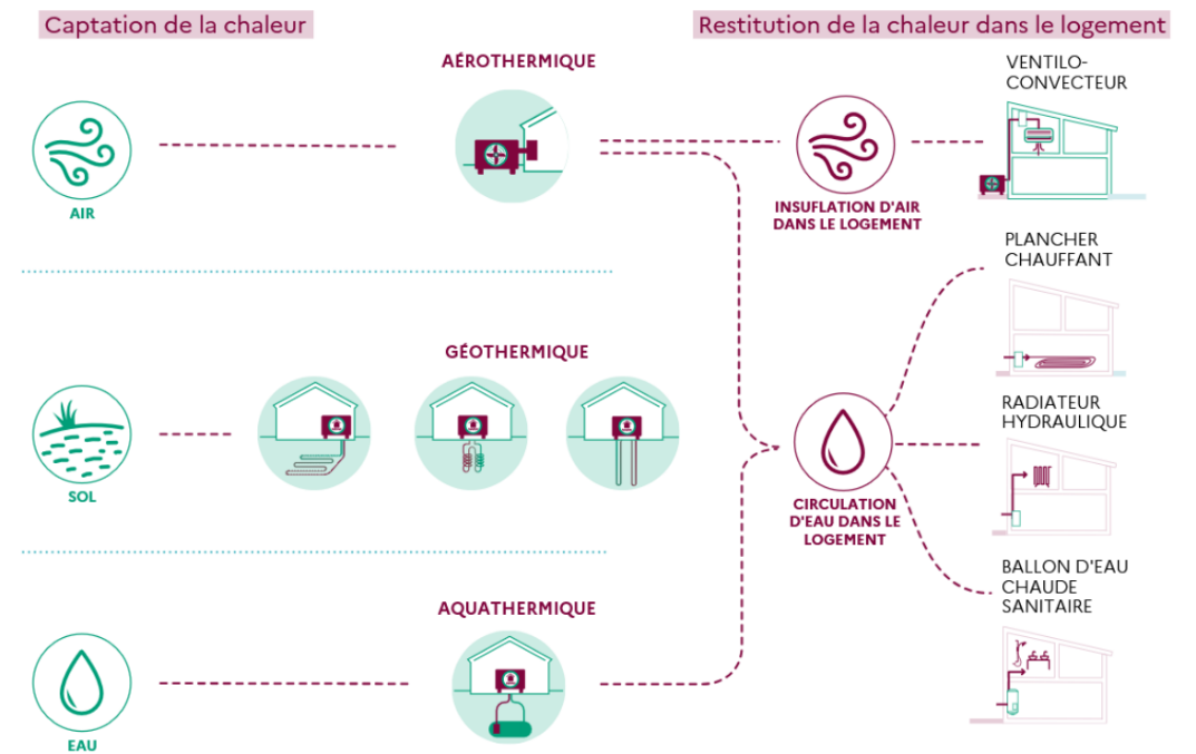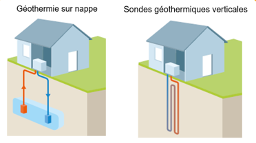 - Les PAC géothermiques vont nécessiter plusieurs forages afin d’aller récupérer de la chaleur en profondeur. Les PAC géothermiques se déclinent en deux catégories : sur champ de sondes qui prélèvent de la chaleur dans le sol ; et sur nappe qui prélève de la chaleur dans l’eau des nappes phréatiques (aussi appelées PAC aquathermiques).